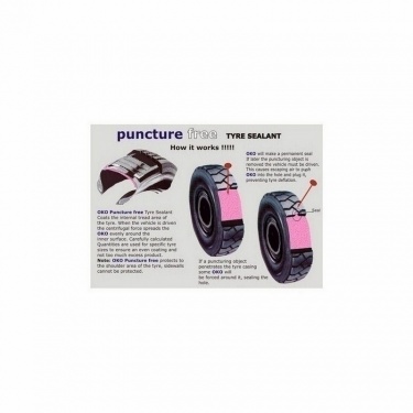 OKO is applied to the tyre via the valve system. The revolving tyre causes the OKO product to coat the inside of the tyre tread area providing a man body of sealant protective, ready to seal any puncture. When the trye is punctured, air pressure forces OKO Puncture Free into te hole where the tyre sealant compresses to form a permanent airtight seal. The sealing action is virtually instantaneous and minimal air pressure is lost
